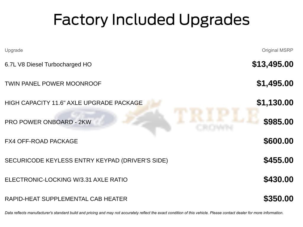 This 2026 Ford F-250SD comes nicely equipped with Ford Connectivity Package (1-Year Included), FX4 Off-Road Package (Hill Descent Control, Off-Road Specifically Tuned Shock Absorbers, and Unique FX4 Off-Road Box Decal), GVWR: F-250 >10K Package, High Capacity 11.6 Axle Upgrade Package, Internet access capable: 5G Modem - Ford Connectivity Package, Order Code 700A (Flow-Through Console, Radio: B&O Unleashed Sound System by Bang & Olufsen, SiriusXM with 360L, SYNC 4 with Enhanced Voice Recognition, Unique King Ranch Leather 40/Console/40 Seats, and Wheels: 20 Bright Machined Aluminum), 14 Speakers, 4-Wheel Disc Brakes, 410 Amp Dual Alternators, ABS brakes, Adjustable pedals, Air Conditioning, Alloy wheels, AM/FM radio: SiriusXM with 360L, Auto High-beam Headlights, Auto tilt-away steering wheel, Auto-dimming Rear-View mirror, Automatic temperature control, Brake assist, Compass, Delay-off headlights, Driver door bin, Driver vanity mirror, Dual front impact airbags, Dual front side impact airbags, Electronic Stability Control, Emergency communication system: SYNC 4 911 Assist, Engine Block Heater, Front anti-roll bar, Front Bucket Seats, Front Center Armrest, Front dual zone A/C, Front fog lights, Front License Plate Bracket, Front reading lights, Fully automatic headlights, Garage door transmitter, Heads-Up Display, Heated door mirrors, Heated front seats, Heated rear seats, HEATED STEERING WHEEL, Illuminated entry, Leather steering wheel, LED Roof Clearance Lights, Low tire pressure warning, Memory seat, Navigation system: Connected Navigation, Outside temperature display, Overhead airbag, Overhead console, Panic alarm, Passenger door bin, Passenger vanity mirror, Pedal memory, Power door mirrors, Power driver seat, Power passenger seat, Power steering, Power windows, Pro Power Onboard - 2kW, Rain–Sensitive Windshield Wipers, Rapid-Heat Supplemental Cab Heater, Rear reading lights, Rear seat center armrest, Rear step bumper, Rear window defroster, Remote keyless entry, SecuriCode Keyless Entry Keypad (driver's Side), Security system, Speed control, Split folding rear seat, Steering wheel memory, Steering wheel mounted A/C controls, Steering wheel mounted audio controls, Tachometer, Telescoping steering wheel, Tilt steering wheel, Traction control, Trip computer, Turn signal indicator mirrors, Twin Panel Power Moonroof, Upfitter Switches (6), Variably intermittent wipers, and Ventilated front seats.
