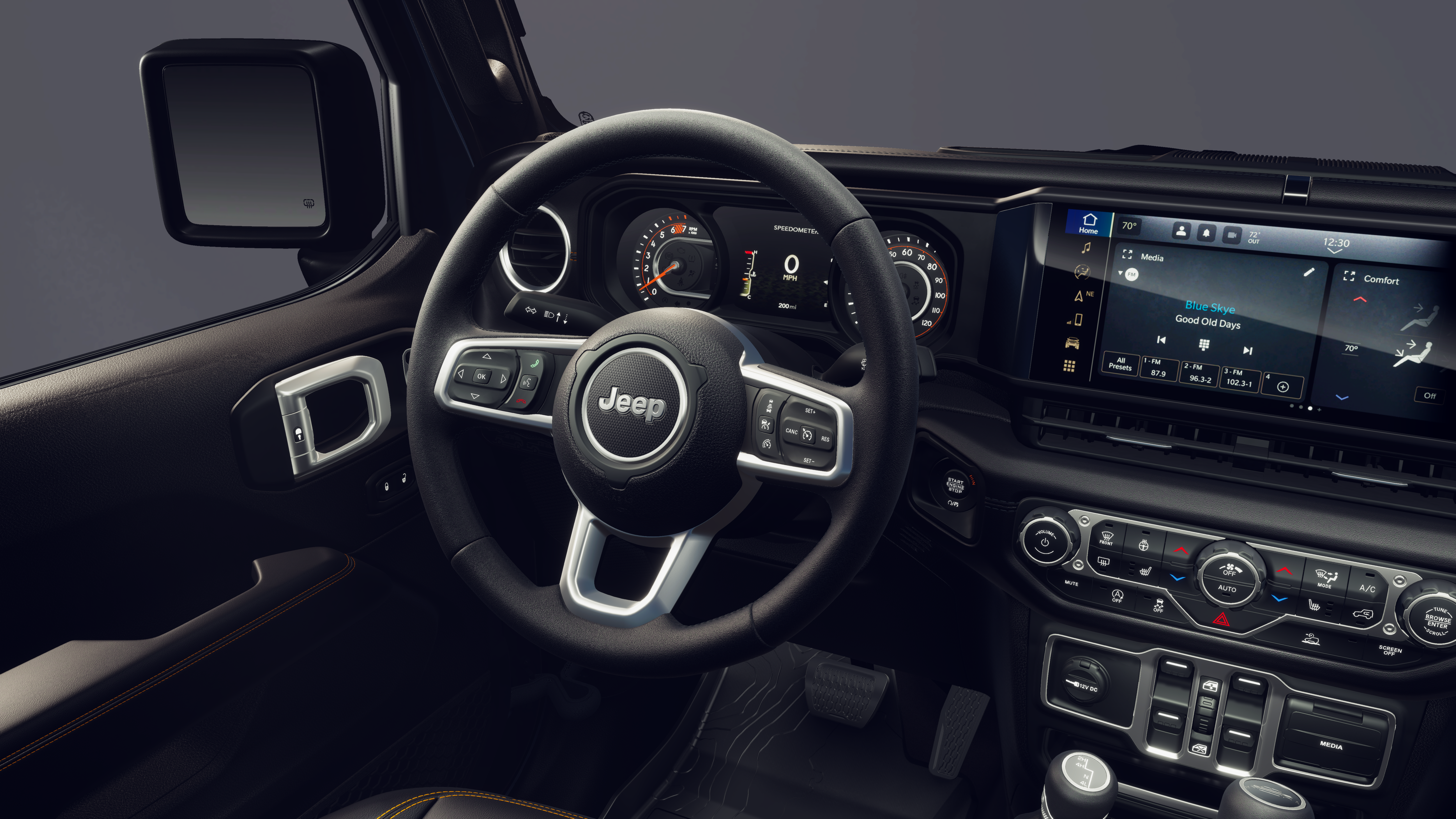 Inside, the Gladiator Texas Trail offers a premium, well-appointed cabin that combines comfort and convenience. The leather-wrapped steering wheel, heated front seats, and dual-zone automatic climate control ensure a pleasant driving experience, while the 12.3-inch touchscreen display and integrated technology features keep you connected and entertained.