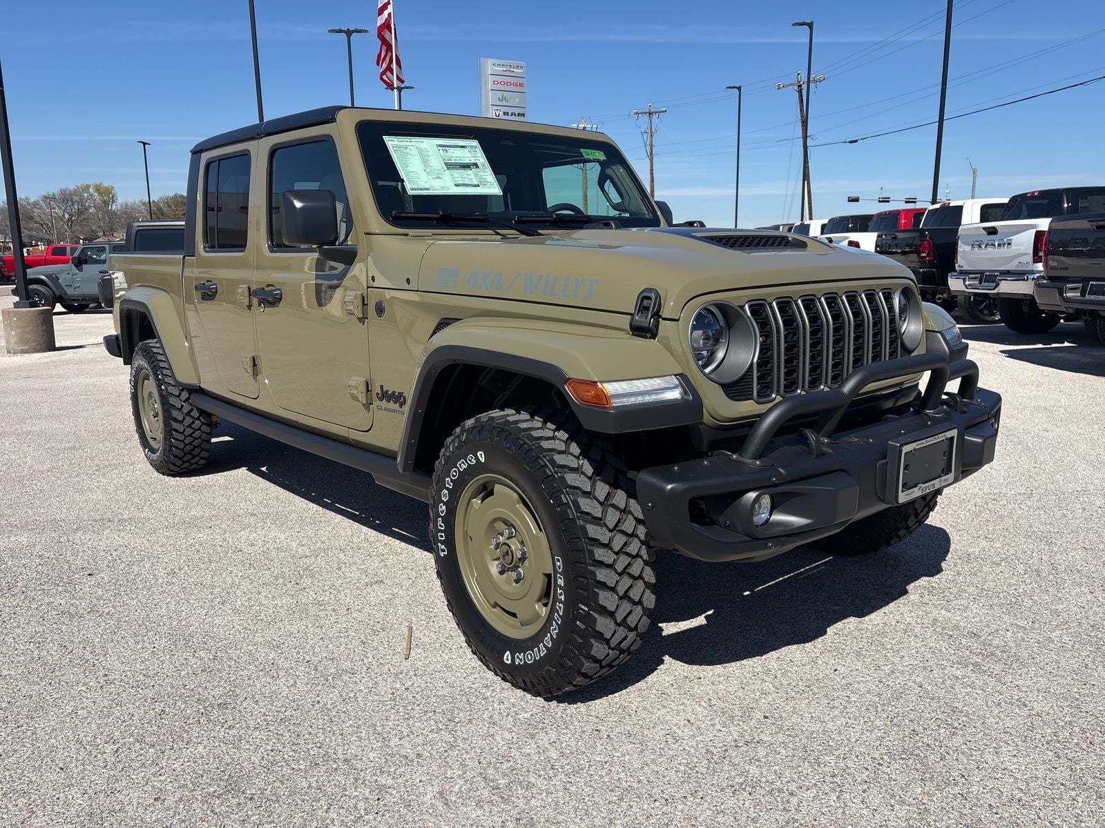 This 2026 Jeep Gladiator Willys in 41 comes with the following features: 4D Crew Cab, 3.6L V6 24V VVT, 4WD, 41, Heritage Tan/Black Cloth, ABS brakes, Compass, Electronic Stability Control, Illuminated entry, Low tire pressure warning, ParkView Rear Back-Up Camera, Remote keyless entry, Traction control, 110 Mph Vehicle Max Speed Calibration, 12.3 Touchscreen Display, 3.73 Rear Axle Ratio, 4-Wheel Disc Brakes, 4G LTE Wi-Fi Hot Spot, 8 Speakers, Air Conditioning, Alexa Built-in, AM/FM radio: SiriusXM with 360L, Apple CarPlay, Apple CarPlay/Android Auto, Brake assist, Connectivity - US/Canada, Delay-off headlights, Driver door bin, Driver vanity mirror, Dual front impact airbags, Dual front side impact airbags, For Details, Visit DriveUconnect.com, Front anti-roll bar, Front Bucket Seats, Front Center Armrest w/Storage, Front fog lights, Front reading lights, Google Android Auto, Integrated Center Stack Radio, Integrated roll-over protection, Normal Duty Suspension, Occupant sensing airbag, Outside temperature display, Overhead airbag, Panic alarm, Passenger door bin, Passenger vanity mirror, Power steering, Power windows, Radio data system, Radio: Uconnect 5 with 12.3 Display, Rear anti-roll bar, Rear reading lights, SiriusXM Radio Service, SiriusXM with 360L, Speed control, Split folding rear seat, Steering wheel mounted audio controls, Tachometer, Telescoping steering wheel, Tilt steering wheel, Trip computer, USB Host Flip, Variably intermittent wipers, Voltmeter, and Wheels: 17 x 7.5 Black Steel StyleD. New Price! 41 2026 Jeep Gladiator Willys 4WD 8-Speed Automatic 3.6L V6 24V VVT 4D Crew Cab, 3.6L V6 24V VVT, 4WD, 41, Heritage Tan/Black Cloth, ABS brakes, Compass, Electronic Stability Control, Illuminated entry, Low tire pressure warning, ParkView Rear Back-Up Camera, Remote keyless entry, Traction control.