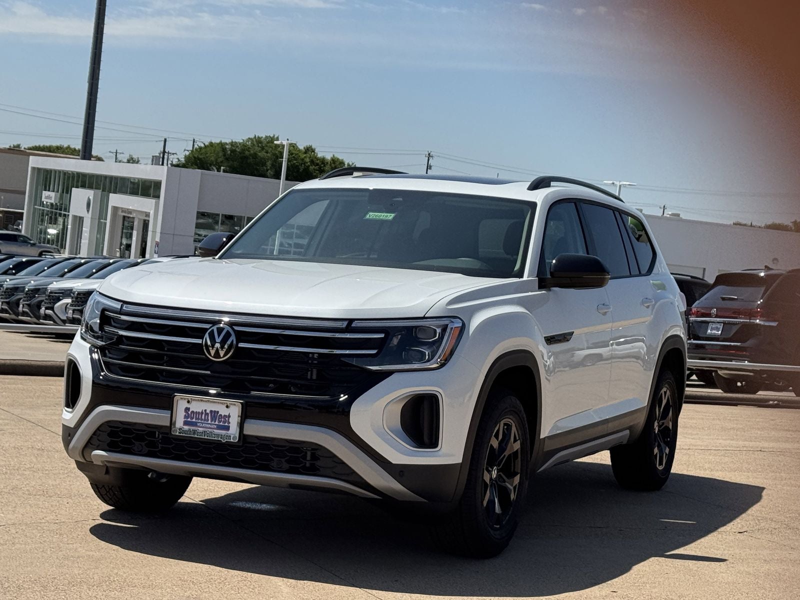 This 2026 Volkswagen Atlas 2.0T Peak Edition in Opal White Pearl comes with the following features: 2.0L TSI 8-Speed Automatic with Tiptronic AWD 18 Alloy wheels, 3rd row seats: split-bench, 4-Wheel Disc Brakes, 4-Wheel Independent Suspension, 6 Speakers, ABS brakes, Air Conditioning, AM/FM radio: SiriusXM with 360L, Auto High-beam Headlights, Auto-dimming Rear-View mirror, Automatic temperature control, Brake assist, Bumpers: body-color, Compass, Delay-off headlights, Driver door bin, Driver vanity mirror, Dual front impact airbags, Dual front side impact airbags, Electronic Stability Control, Emergency communication system: VW Car-Net Safe & Secure 5-year, Exterior Parking Camera Rear, Four wheel independent suspension, Front anti-roll bar, Front Bucket Seats, Front Center Armrest, Front dual zone A/C, Front fog lights, Front reading lights, Fully automatic headlights, Garage door transmitter: Homelink, Heated and Actively Ventilated Front Bucket Seats, Heated door mirrors, Heated front seats, Heated steering wheel, Illuminated entry, Low tire pressure warning, Occupant sensing airbag, Outside temperature display, Overhead airbag, Overhead console, Panic alarm, Passenger door bin, Passenger vanity mirror, Perforated V-Tex Leatherette Seating Surfaces, Power door mirrors, Power driver seat, Power Liftgate, Power moonroof: Panoramic, Power steering, Power windows, Radio data system, Radio: MIB3 Composition Media, Rain sensing wipers, Rear air conditioning, Rear anti-roll bar, Rear reading lights, Rear seat center armrest, Rear window defroster, Rear window wiper, Remote keyless entry, Security system, Speed control, Speed-sensing steering, Split folding rear seat, Spoiler, Steering wheel mounted audio controls, Tachometer, Telescoping steering wheel, Tilt steering wheel, Traction control, Trip computer, Turn signal indicator mirrors, Variably intermittent wipers, Ventilated front seats, and Wheels: 18 Black Painted 5-Spoke Alloy.