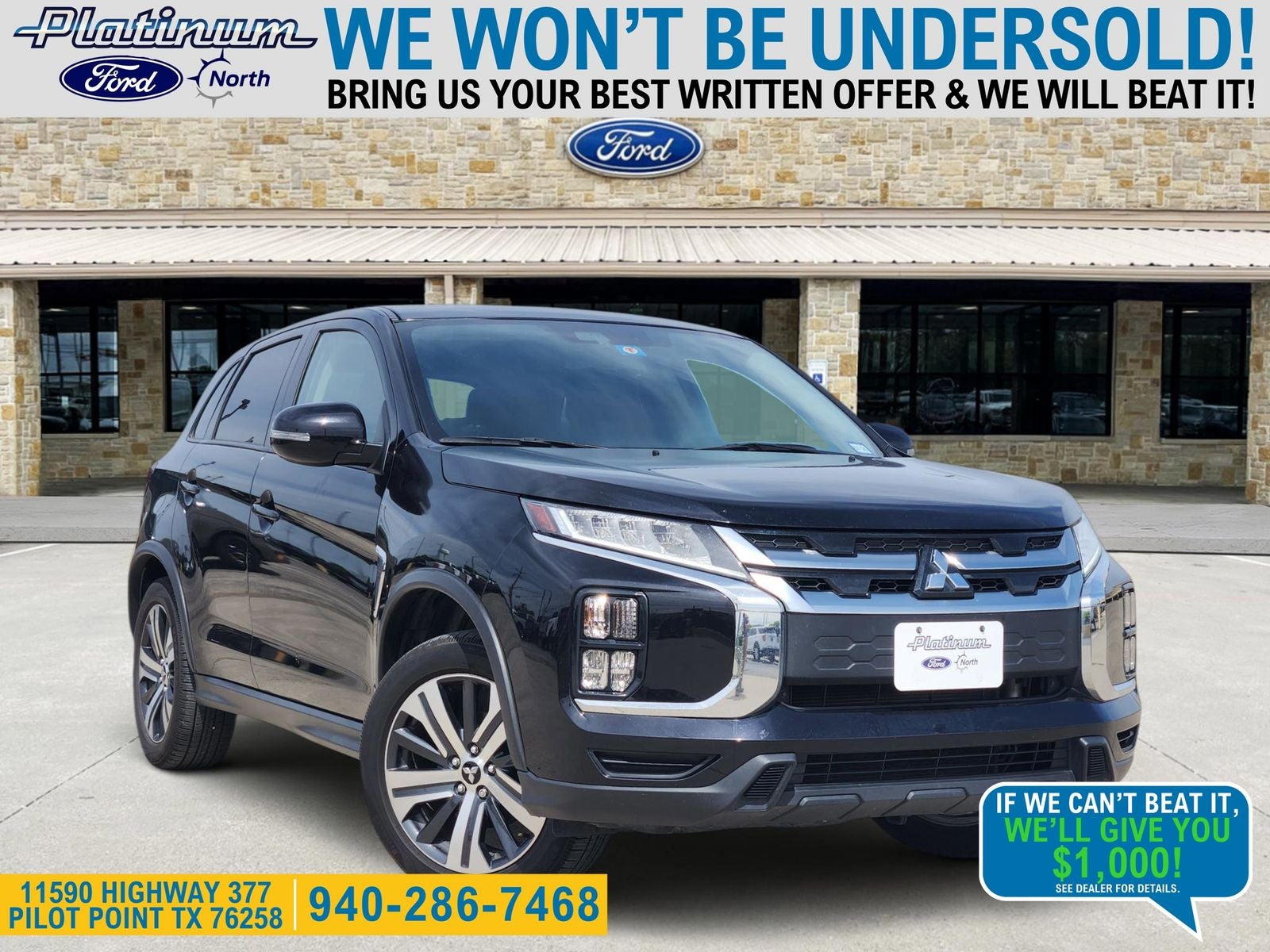 This 2022 Mitsubishi Outlander Sport 2.0 SE in Black comes with the following features: 2.0L I4 SMPI DOHC 16V LEV3-ULEV70 148hp CVT FWD Outlander Sport 2.0 SE, Ford Blue Advantage: Blue Certified Certified, 4D Sport Utility, 2.0L I4 SMPI DOHC 16V LEV3-ULEV70 148hp, CVT, FWD, Black, Black w/Fabric Seat Trim, ABS brakes, Alloy wheels, Electronic Stability Control, Heated door mirrors, Heated Front Bucket Seats, Heated front seats, Illuminated entry, Low tire pressure warning, Remote keyless entry, Traction control, 4-Wheel Disc Brakes, 6 Speakers, 6.026 Axle Ratio, Air Conditioning, AM/FM radio: SiriusXM, Android Auto & Apple CarPlay, Auto High-beam Headlights, Auto-dimming Rear-View mirror, Automatic temperature control, Brake assist, Bumpers: body-color, Combination Soft-Touch Seat Trim, Delay-off headlights, Driver door bin, Driver vanity mirror, Dual front impact airbags, Dual front side impact airbags, Exterior Parking Camera Rear, Four wheel independent suspension, Front anti-roll bar, Front Bucket Seats, Front Center Armrest, Front fog lights, Front reading lights, Fully automatic headlights, Knee airbag, Leather Shift Knob, Occupant sensing airbag, Outside temperature display, Overhead airbag, Panic alarm, Passenger door bin, Passenger vanity mirror, Power door mirrors, Power steering, Power windows, Radio data system, Radio: AM/FM 8.0 Smartphone Link Display Audio, Rain sensing wipers, Rear anti-roll bar, Rear seat center armrest, Rear window defroster, Rear window wiper, Security system, Speed control, Speed-sensing steering, Split folding rear seat, Spoiler, Steering wheel mounted audio controls, Tachometer, Telescoping steering wheel, Tilt steering wheel, Trip computer, Turn signal indicator mirrors, Variably intermittent wipers, and Wheels: 18 Two-Tone Alloy. Certified.